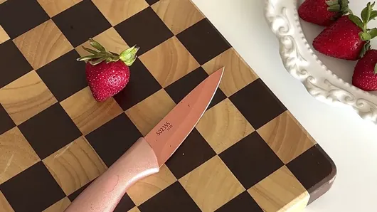 Chop 3/4 cup of strawberries to use in the middle layer of the cakes, and cut the remaining strawberries in half for decoration.
