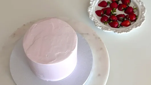 Spread a layer of buttercream frosting on top of one cake layer; evenly spread the chopped strawberries on top of the frosting.