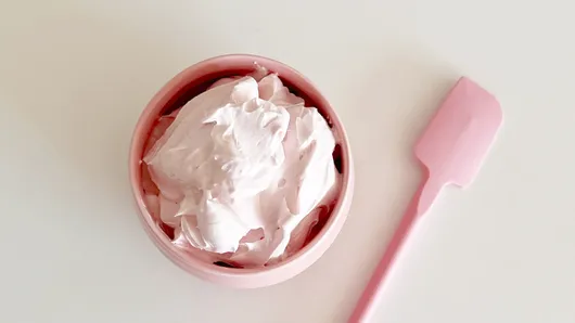 Meanwhile, on medium speed, cream together softened butter, sifted powdered sugar, and vanilla. Mix until fully incorporated and fluffy. Stir in a hint of pink food color to dye the buttercream a baby pink color.