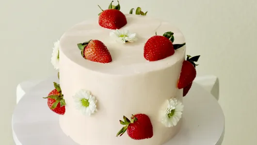 Place cut strawberries all over the cake for decoration, and add optional chamomile flowers for accents.