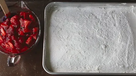 Step4In medium bowl, gently stir together sliced strawberries and strawberry glaze. Spread mixture on top of cream cheese layer. Cut and serve. Store in refrigerator.