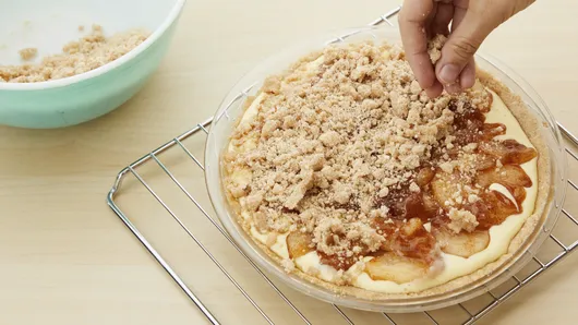 Step4Spread cream cheese mixture in cookie crust. Spoon apple pie filling over cream cheese mixture. Distribute crumbly mixture over top of pie.