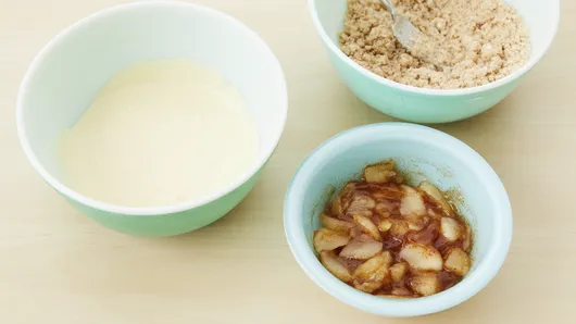 Step3Meanwhile, add 1 tablespoon melted butter to remaining crumbly mixture; toss to combine. In medium bowl, beat cream cheese with electric mixer on medium speed until smooth. Add sugar and flour; blend well. Add vanilla and egg; beat until smooth. In another small bowl, mix apple pie filling and 1/2 teaspoon cinnamon.