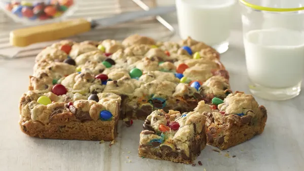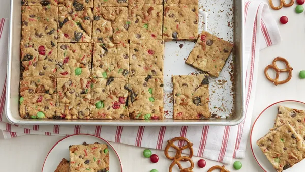 This bar is perfect to round out your cookie exchange -- colorful holiday chocolate candies, white vanilla baking chips and sugar cookie mix makes this a snap to make and bake.