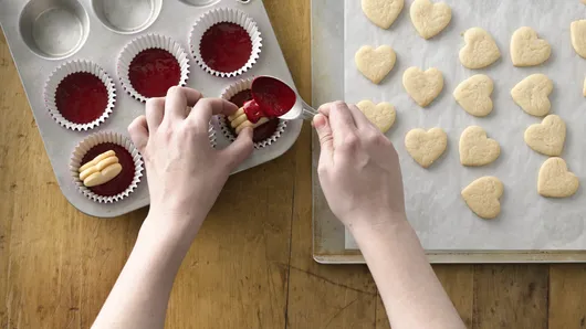 Step1To make Heart Cookies: Heat oven to 375°F. In medium bowl, stir Heart Cookie ingredients until soft dough forms. Roll dough 1/4 inch thick on floured surface. Cut out at least 92 cookies with 1-inch heart-shaped cookie cutter. Place 1 inch apart on ungreased cookie sheet.