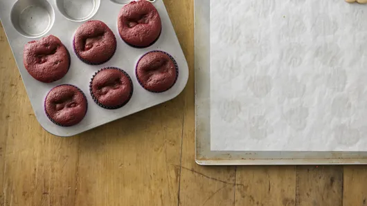 Step4Spoon 2 level tablespoons cake batter into each of the paper baking cups. Place row of 3 heart cookies in middle of each cup, standing up in batter. Mark cup or make small cut in cup to identify front of each cupcake. Spoon 1 heaping tablespoon remaining cake batter over heart cookies in each cup, being careful not to tip cookies over.