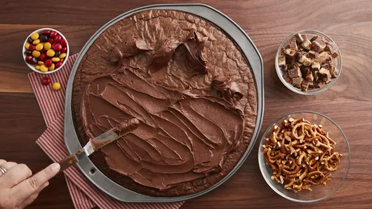 Step4Top with pretzels, chopped candy bar and candies. Cut into wedges to serve. Store loosely covered at room temperature.