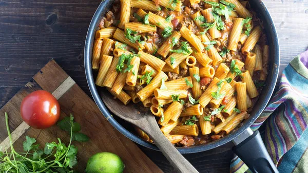 Step2Stir seasoning mix, water, uncooked pasta, corn, beans and tomato into beef. Heat to boiling; stir. Reduce heat to medium-low. Cover; cook 10 to 15 minutes, stirring occasionally, until pasta is desired doneness and most of the liquid has been absorbed.