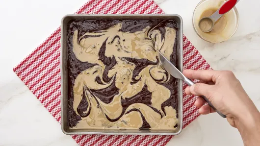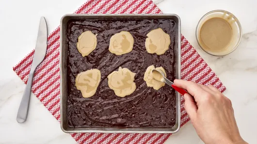 Spoon tahini by teaspoonfuls evenly over brownie batter in pan.