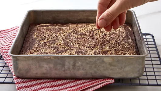 Bake 32 to 34 minutes (for nonstick pan, shorten time by 2 to 3 minutes) or until toothpick inserted 2 inches from side of pan comes out almost clean. Cool completely on cooling rack, about 2 hours. For 16 brownies, cut into 4 rows by 4 rows. Store covered at room temperature.