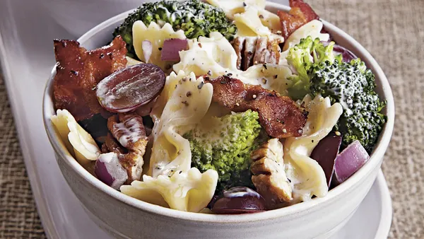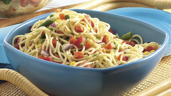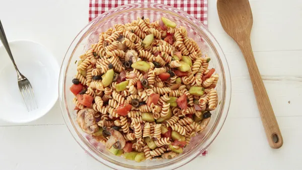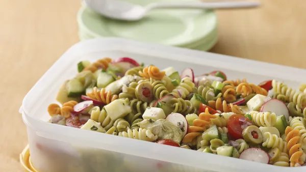Step3In large bowl, mix cooked pasta with remaining salad ingredients and 1/4 cup of the basil. Pour dressing over salad; toss until coated. Cover; refrigerate 2 to 3 hours to blend flavors.
