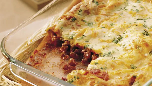 Step1Heat oven to 375°F. Spray 8-inch square (2-quart) glass baking dish with nonstick cooking spray. In large skillet, cook ground beef and onion over medium-high heat until beef is thoroughly cooked, stirring frequently. Drain.