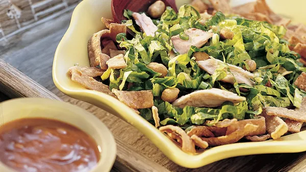 Step2In medium bowl, place chicken, coleslaw mix, cucumber, cilantro and peanuts. Add dressing; toss to coat.