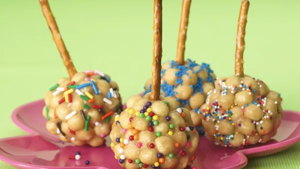 Step2In medium microwavable bowl, microwave marshmallow crème uncovered on High about 2 minutes, stirring after 1 minute, until melted. Pour over cereal mixture, stirring until evenly coated. Spread on cookie sheet; sprinkle with candies.