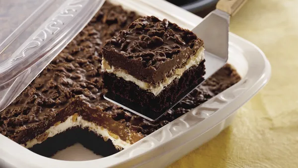 Step3In small microwavable bowl, microwave topping ingredients uncovered on High 30 to 60 seconds; stir until smooth. Cool 10 minutes; spread over filling. Refrigerate about 30 minutes or until set. For brownies, cut into 9 rows by 4 rows. Store covered in refrigerator.