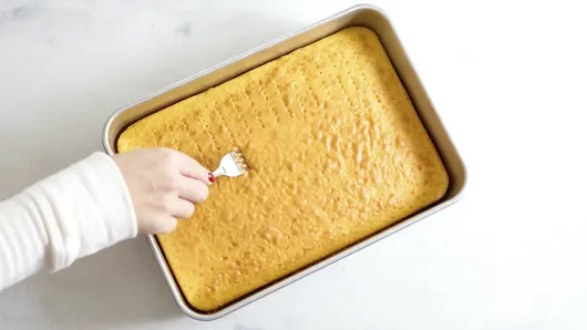 Bake 24 to 28 minutes or until a toothpick inserted in the center comes out clean. Remove the cake from the oven to a cooling rack; let stand for 5 minutes. Using a fork, poke holes every 1/2 inch over the top of the cake. If necessary, wipe fork tines occasionally with a paper towel to reduce sticking.