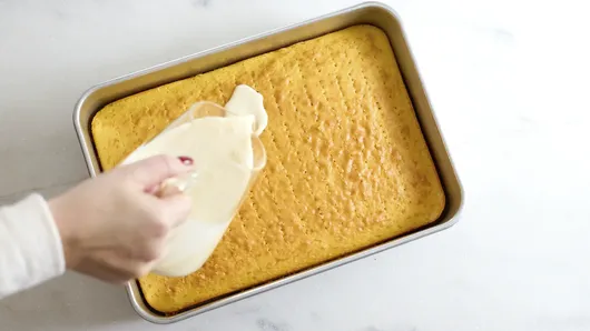 In a large bowl, stir together the Tres Leches ingredients until blended. Carefully pour evenly over top of cake, working back and forth to fill the holes. Refrigerate for about 2 hours or until chilled.