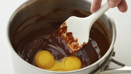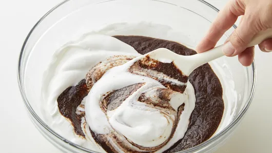 In large bowl, beat egg whites with electric mixer on high speed until foamy. Beat in sugar, 1 tablespoon at a time, until soft peaks form. Fold chocolate mixture into egg whites. Spread in pan.