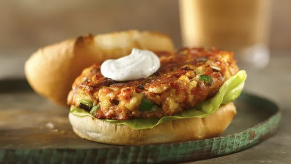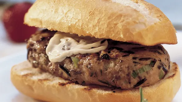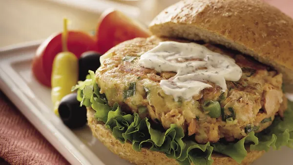 Step1In medium bowl, mix all ingredients except butter, buns and dill dip. Shape mixture into 4 patties, 3 1/2 inches in diameter, using heaping 1/2 cupful for each patty.