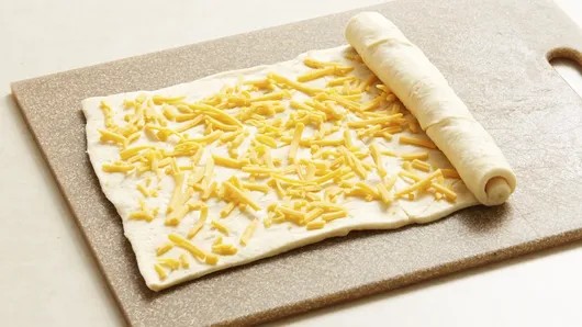 Step3Unroll dough; firmly press perforations to seal. Sprinkle dough with remaining 1/2 cup cheese. Starting at short side, roll up dough; pinch seam to seal. Using serrated knife, cut roll into 8 slices. Place slices, cut side up, on top of tuna mixture.