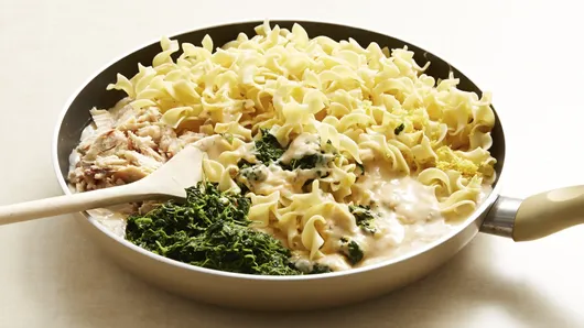 Step2Meanwhile, in 12-inch skillet, mix the soup and 1 1/2 cups of the cheese. Cook over medium heat, stirring occasionally, until cheese is melted. Stir in cooked noodles, tuna, spinach, milk and lemon zest; heat until bubbly. Spoon mixture into casserole.