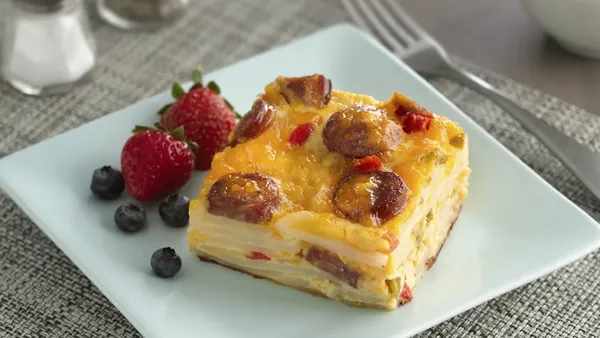 Serve 12 a special morning entrée with ease. Featuring a colorful, fresh tomato topping, this casserole is made the night before.