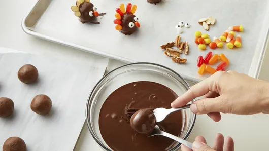 var configuration = {"title":"Turkey Cookie Truffles","introduction":"It all depends on who you ask, but we wouldn’t be surprised to hear one of these turkeys is the real star of Thanksgiving! With their chocolate-chocolate chip cookie bodies and their tasty tail feathers—made from anything you desire, from candy corn and Mike and Ike® candy to pecans and more—these turkeys are a particular hit among the under-10 set. So why not make a little family of gussied-up gobblers this holiday? We can’t think of a better incentive for cleaning your plate!","servingSize":"1 Truffle","image":{"small":{"media":"(min-width: 0px)","src":"https://mojo.generalmills.com/api/public/content/DTUGus4EnE6P_GIUjBcW8Q_webp_base.webp?v=6524a188\u0026t=e724eca7b3c24a8aaa6e089ed9e611fd"},"medium":{"media":"(min-width: 500px)","src":"https://mojo.generalmills.com/api/public/content/DTUGus4EnE6P_GIUjBcW8Q_webp_base.webp?v=6524a188\u0026t=191ddcab8d1c415fa10fa00a14351227"},"large":{"media":"(min-width: 767px)","src":"https://mojo.generalmills.com/api/public/content/DTUGus4EnE6P_GIUjBcW8Q_webp_base.webp?v=6524a188\u0026t=191ddcab8d1c415fa10fa00a14351227"},"alt":"Turkey Cookie Truffles"},"contributor":{"label":"By","name":"Betty Crocker Kitchens","profileUrl":"/about-us","displayDate":{"label":"Updated","date":"Aug 16, 2019"}},"ingredientGroups":[{"ingredients":[{"quantity":"1","description":"pouch (17.5 oz) Betty Crocker™ Chocolate Chip Cookie Mix","productLink":"/products/cookiemix/chocolatechip"},{"quantity":"","description":"Butter and egg called for on cookie mix pouch"},{"quantity":"4","description":"oz (half of 8-oz package) cream cheese, softened"},{"quantity":"2","description":"cups semisweet chocolate chips"},{"quantity":"2","description":"tablespoons shortening"},{"quantity":"48","description":"Betty Crocker™ Candy Shoppe eyeballs"},{"quantity":"","description":"Assorted candies, nuts and sprinkles for decorating (such as candy corn, orange and yellow M\u0026M’s® candy-coated milk chocolate candies, Mike and Ike® original assorted soft fruit candy, pecan halves, sliced almonds, Betty Crocker™ chocolate sprinkles)"}]}],"steps":[{"description":"Heat oven to 375°F. Make and bake drop cookies as directed on pouch. Cool completely, at least 20 minutes."},{"description":"In food processor, process half of the cookies until fine crumbs. Remove and set aside; continue and process remaining cookies to fine crumbs. Combine all of cookie crumb mixture in food processor. Add cream cheese. Process until well combined and can be pressed into a ball, 1 to 2 minutes. Shape cookie mixture into 24 (1 1/2-inch) balls; place on cookie sheet lined with waxed paper. Refrigerate 30 minutes.","stepShotImageUrl":"//mojo.generalmills.com/api/public/content/I0YFGjiKWEKKoxdkkTfvpA_webp_base.webp?v=77d4be45\u0026t=51a43a57af4046789e5a7f20567b1195"},{"description":"In medium microwavable bowl, microwave chocolate chips and shortening uncovered on High 60 seconds. Stir; continue to microwave in 15-second increments until mixture can be stirred smooth."},{"description":"Remove one-third of cookie balls at a time from refrigerator. Place on second waxed paper-lined cookie sheet. Using 2 forks, dip and roll chilled cookie balls, one at a time, into melted chocolate; tap off excess chocolate. Return to lined cookie sheet, and immediately press in eyeballs. Decorate using candies, nuts and sprinkles as desired, using photo as a guide. Repeat with remaining cookie balls. If chocolate has cooled too much, reheat. Refrigerate about 15 minutes or until chocolate is set. Store covered in refrigerator.","stepShotImageUrl":"//mojo.generalmills.com/api/public/content/sm7ycCWnkEmG1uAT59rWmA_webp_base.webp?v=980f4e0d\u0026t=51a43a57af4046789e5a7f20567b1195"}],"tips":[{"title":"","description":"Plastic forks are the key to easy dipping. Remove the center two tines of two forks, and you’ll have wide-pronged tools perfect for gently dipping cookie truffles. It’s easier to dip cookie truffles when they are chilled, so don’t get ahead of yourself. Work with one-third of your truffles at a time for best results.\n","category":"Techniques","tipShots":[]},{"title":"","description":"After dipping truffles, don’t delay adding sprinkles, candy corn, nuts and other decorations. Since melted chocolate sets up quickly, take it one turkey at a time.\n","category":"Techniques","tipShots":[]},{"title":"","description":"Kitchen Tested: 6/2019","category":"Kitchen Tested","tipShots":[]},{"title":"","description":"Be patient as you stick candy corn \u0022feathers\u0022 in the cookie ball. Usually just a little push is all that’s needed to put in place. The chocolate will also help hold them in place. Broken bits of candy corn make great beaks, so don’t be discouraged by less-than-perfect pieces. Let them inspire you!","category":"Techniques","tipShots":[]},{"title":"","description":"Keep your turkeys refrigerated until ready to eat.\n","category":"Storage","tipShots":[]}],"kitchenTips":[{"title":"","description":"Plastic forks are the key to easy dipping. Remove the center two tines of two forks, and you’ll have wide-pronged tools perfect for gently dipping cookie truffles. It’s easier to dip cookie truffles when they are chilled, so don’t get ahead of yourself. Work with one-third of your truffles at a time for best results.\n","category":"Techniques","tipShots":[]},{"title":"","description":"After dipping truffles, don’t delay adding sprinkles, candy corn, nuts and other decorations. Since melted chocolate sets up quickly, take it one turkey at a time.\n","category":"Techniques","tipShots":[]},{"title":"","description":"Be patient as you stick candy corn \u0022feathers\u0022 in the cookie ball. Usually just a little push is all that’s needed to put in place. The chocolate will also help hold them in place. Broken bits of candy corn make great beaks, so don’t be discouraged by less-than-perfect pieces. Let them inspire you!","ca