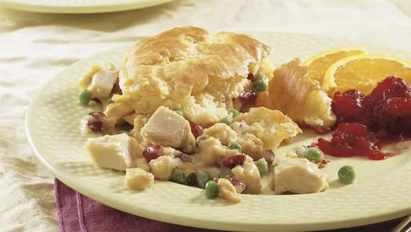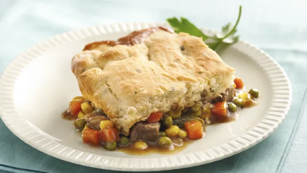 Step1Heat oven to 375°F. In 3-quart saucepan, heat turkey, frozen vegetables, onion and gravy to boiling over medium heat, stirring frequently. Boil and stir 1 minute. Keep warm.