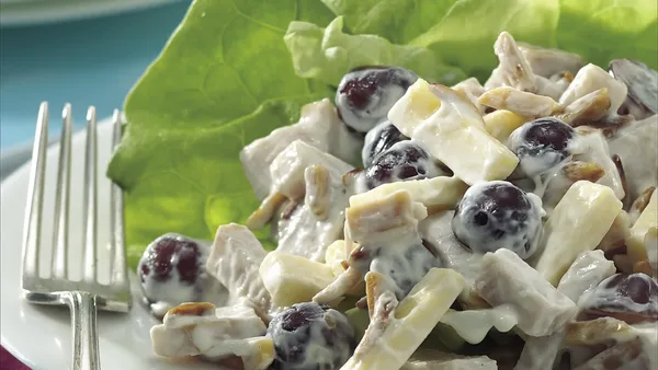 - 3/4 lb cooked turkey breast, cut into 1/2-inch cubes (2 cups)