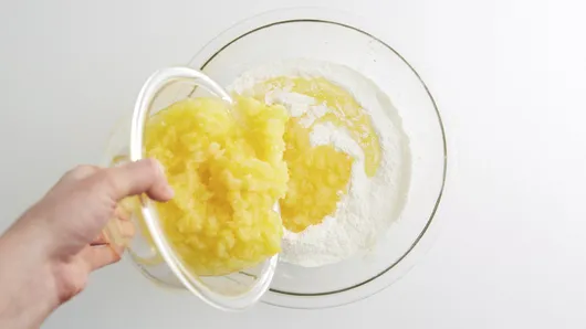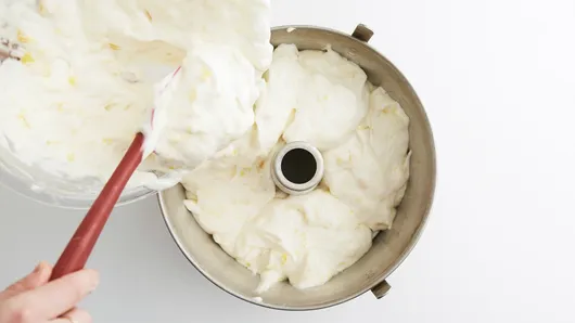 In large bowl, beat dry angel food cake mix and crushed pineapple on low speed 30 seconds; beat on medium speed 1 minute. Pour into ungreased 10-inch tube pan.