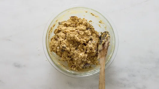 In a large bowl, stir the brown sugar, butter, baking soda, cinnamon, vanilla, salt, and eggs with a wooden spoon until well mixed. Stir in the oats, flour, and raisins until well blended.