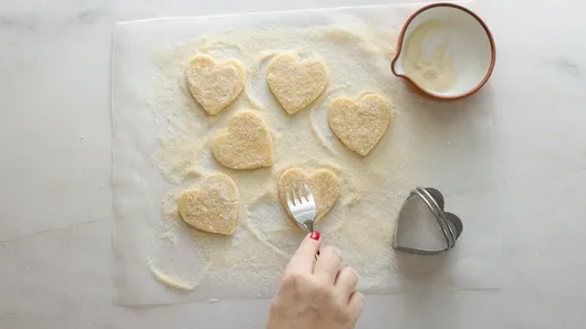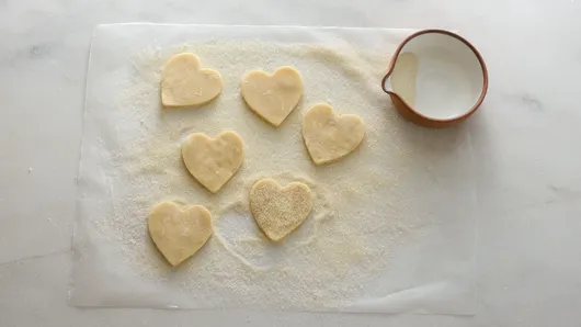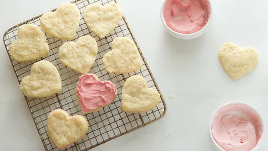 Heat oven to 375°F. Roll one-third of the dough at a time to 1/8-inch thickness on a lightly floured surface. (Keep remaining dough refrigerated until ready to roll.) Cut with a 2 1/4-inch heart-shaped cookie cutter.