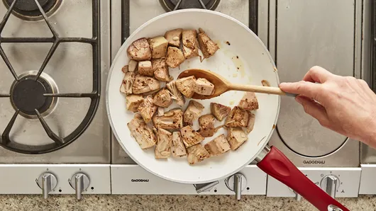 Step1In 10-inch skillet, heat 2 tablespoons of the oil over medium-high heat. Add jackfruit, garlic powder, pepper flakes and nutmeg; cook 5 to 6 minutes, stirring occasionally with wooden spoon or heatproof spatula, until jackfruit begins to brown on edges.