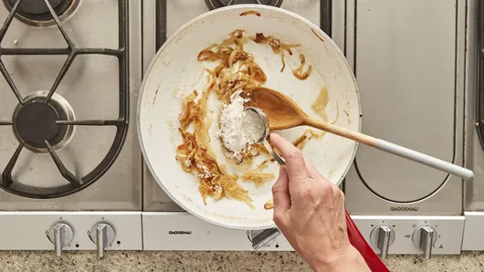 Step3In same skillet, heat remaining 2 tablespoons oil over medium heat. Add onion and salt; cook 11 to 13 minutes, stirring frequently, until softened and browned. Stir in flour; cook 1 minute, stirring constantly.