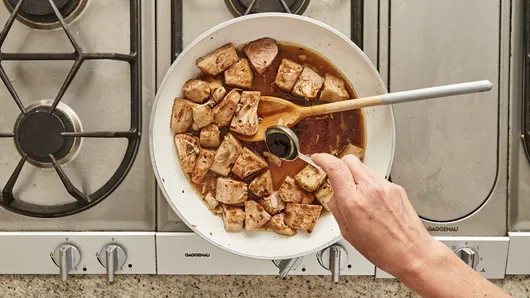 Step2Stir brown sugar into mixture in skillet; cook 30 to 60 seconds, stirring constantly, until brown sugar melts. Carefully stir in water and soy sauce; heat to simmering, then reduce heat to medium-low. Cook uncovered 4 to 6 minutes longer, stirring frequently and breaking up with spoon, until mixture is shredded and liquid is absorbed. Transfer to medium bowl; cover and keep warm. Carefully clean out skillet.