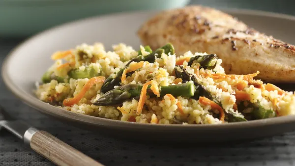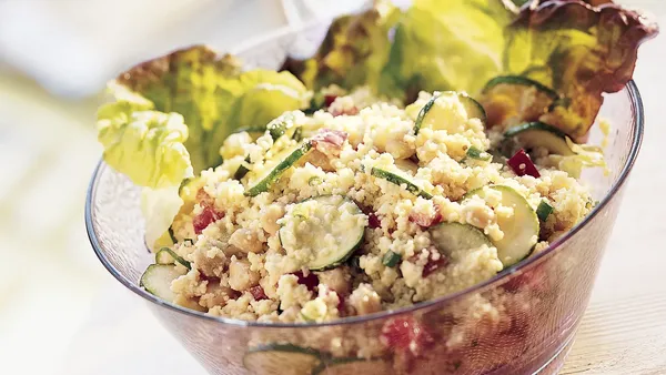 Carrots and zucchini seasoned with turmeric, coriander and red pepper top off quick-cooking couscous.