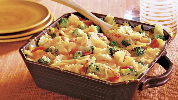 Step2Stir in vegetable mixture, broccoli and Alfredo sauce; reduce heat to medium. Cover; cook 5 to 6 minutes, stirring occasionally, until hot. Spoon into ungreased 8-inch square (2-quart) glass baking dish.
