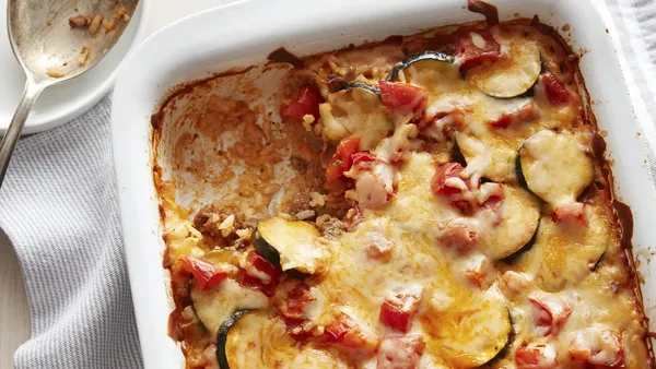 Step3Meanwhile, make rice mix as directed on package—except omit butter. Stir rice mixture, soup, milk and pepper into beef. Spoon into casserole.